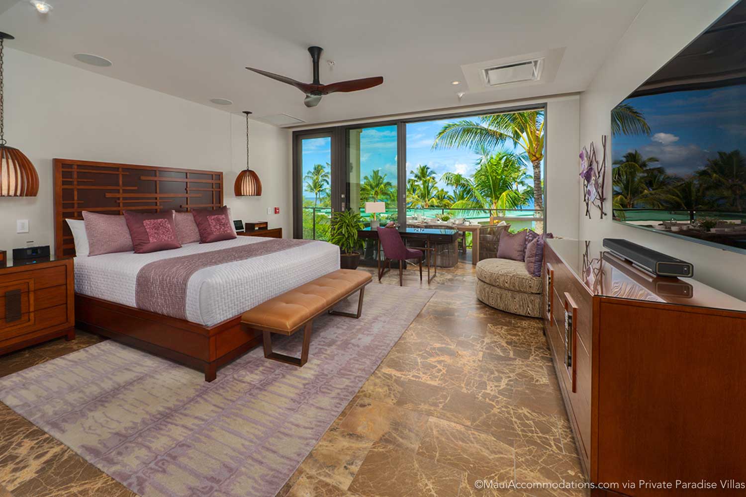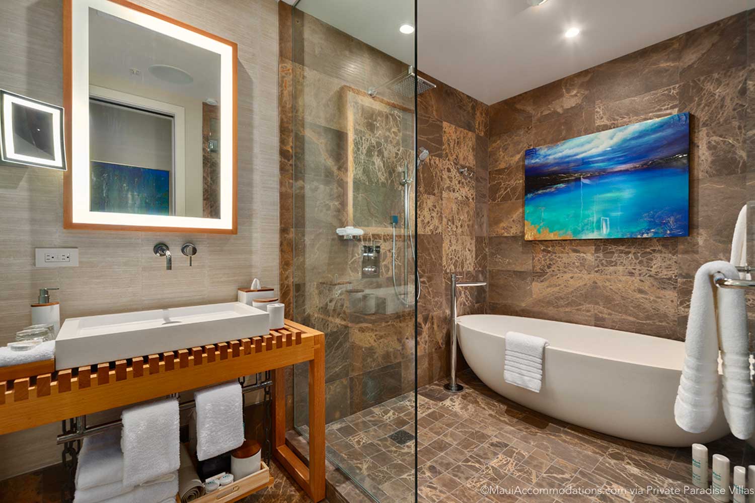 Amore Aloha Villa 813 at Andaz Maui at Wailea Resort was recently purchased by new owners and was hand-crafted using only the best quality decor and furniture. This privately-owned, independently-managed 3 bedroom 4 bath FULL ocean view resort residence offers “5-star” quality modern comfort and convenience with state-of-the-art electronics, original art accented with extended lighting, exceptionally well-equipped kitchen, new bed and bath linens, ultra-plush pillow-top beds and more!