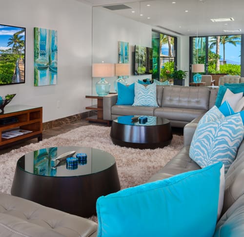 Each individually themed room is decorated with modern furnishings that are both comfortable and high-style at the same time. Sea glass accents appear throughout the villa in beautiful shades of turquoise, aqua, seafood, mint and teal. Ultra-thin true HD Samsung televisions are cleanly wall-mounted in every room along with HD cable boxes and complimentary Netflix.