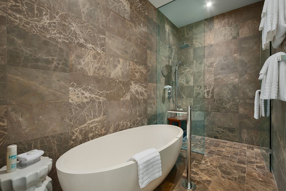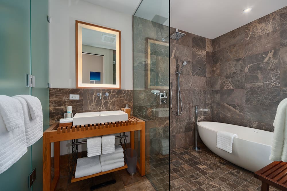 Plush pillow top mattresses, down pillows, down comforters and high thread count all-cotton bedding will tempt you to stay in bed all day. Extra pillows and blankets are pre-stocked in the closets. The bathrooms are loaded with thick soft all-cotton towels, hair dryer, make-up mirror, bathrobes, and a bath scale. Tropical theme toiletries are offered in oversized bottles – an eco-friendly gesture.