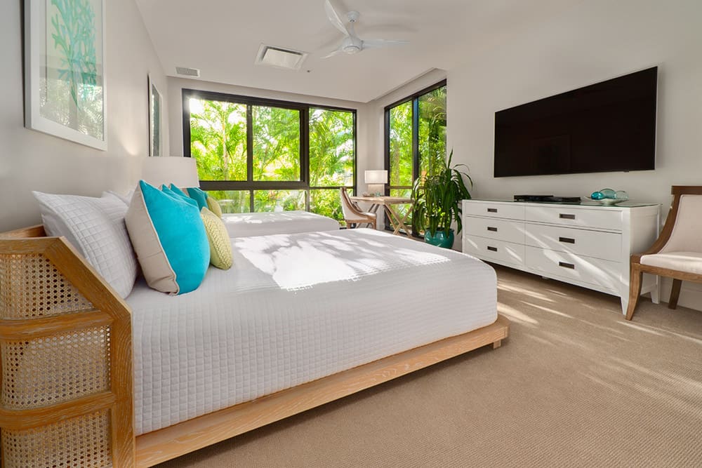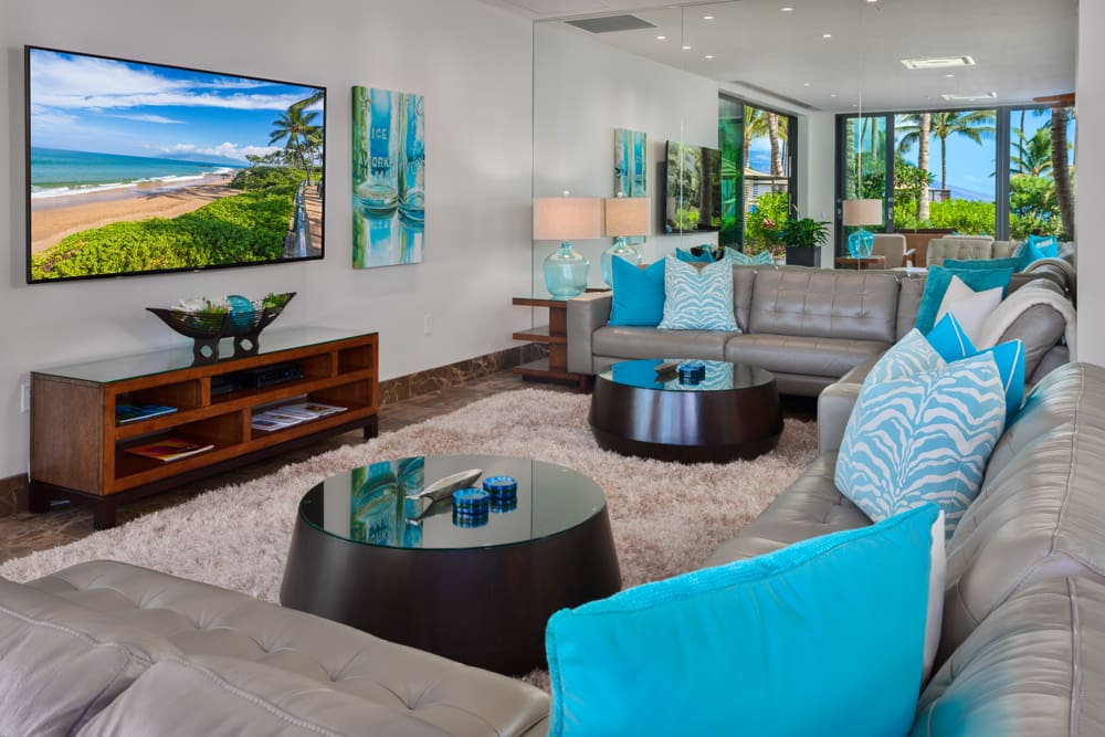 Each individually themed room is decorated with modern furnishings that are both comfortable and high-style at the same time. Sea glass accents appear throughout the villa in beautiful shades of turquoise, aqua, seafood, mint and teal. Ultra-thin true HD Samsung televisions are cleanly wall-mounted in every room along with HD cable boxes and complimentary Netflix.