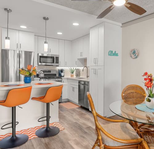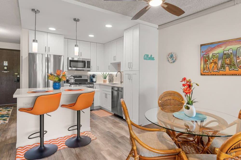 This newly remodeled kitchen is equipped with quartz countertops, state-of-the-art stainless steel appliances, and a wide range of cookware and utensils, so the kitchen provides everything you need to prepare meals. Enjoy your dinner at the dining table, at the island bar, or take your meals outside to the private, ground-floor lanai, where you can enjoy your meal and tropical beverages while taking in the Maui breeze and breathtaking sunsets.