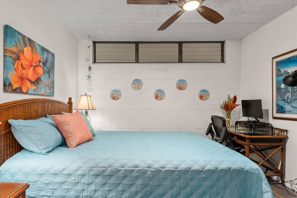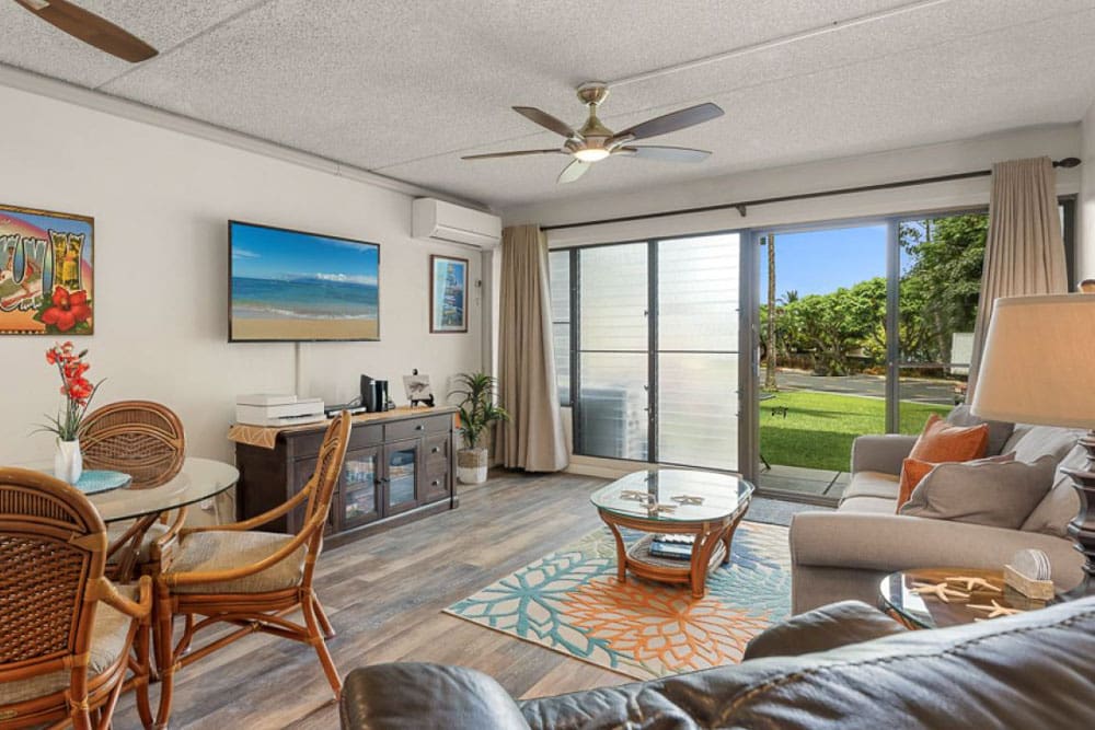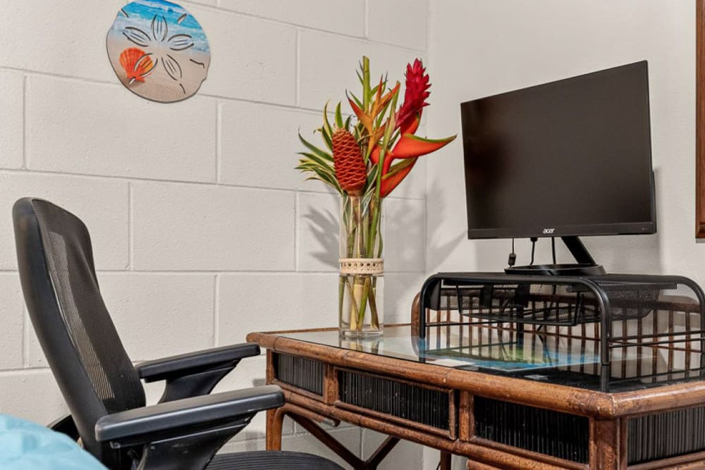 And let’s talk about how remote work-friendly Kihei Akahi DG06 is. This condo is outfitted so that you can be productive on the go. There is wi-fi throughout, a desk with a comfortable desk chair, monitor, printer, and more. You can even work right outside on your lanai to enjoy the Kihei weather while you work (talk about jealous co-workers on your next Zoom call!).