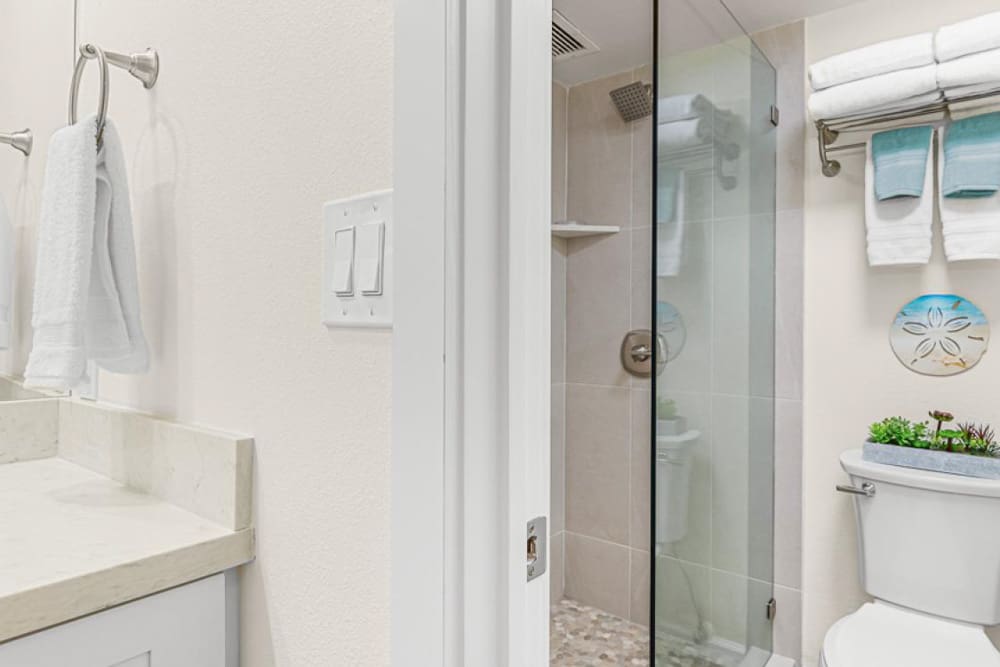 When it’s time to sleep, the bedroom offers a comfortable queen-sized bed. Thanks to the Split AC system, you can adjust the temperature to your liking, ensuring that you stay cool and comfortable throughout the night. The newly remodeled bathroom is equipped with modern fixtures, quartz counters, featuring a walk-in shower with a rain shower head.