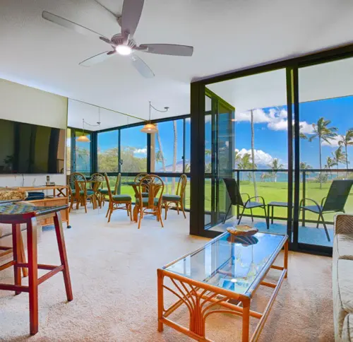 Because this condo is located on the ocean away from Kihei Road, there is no traffic, road noise, or utility poles and wires – just an unobstructed view of the ocean, west Maui mountains and the protected green belt along the shore. The green belt towards Kihei has excellent turtle and bird watching.