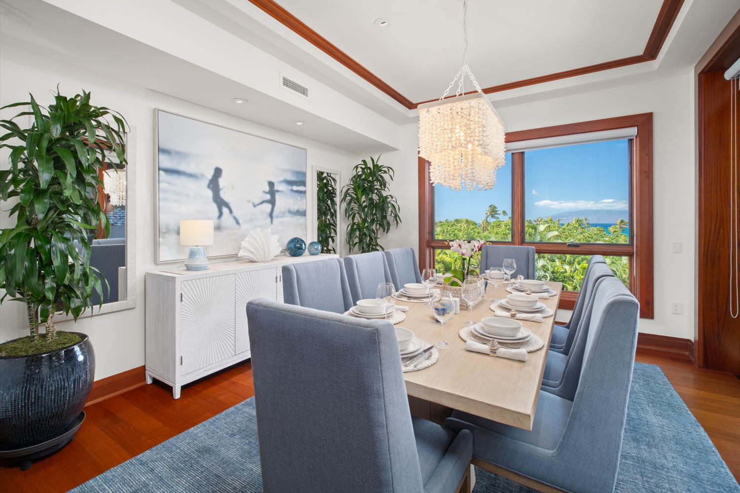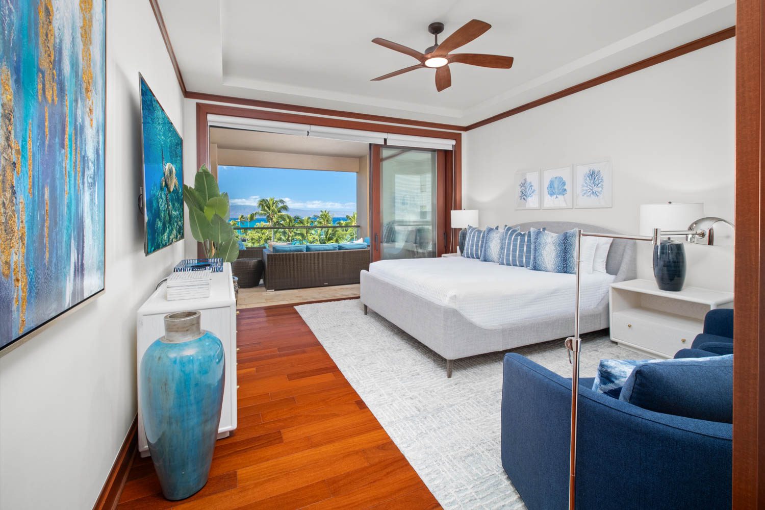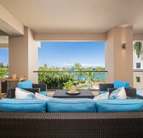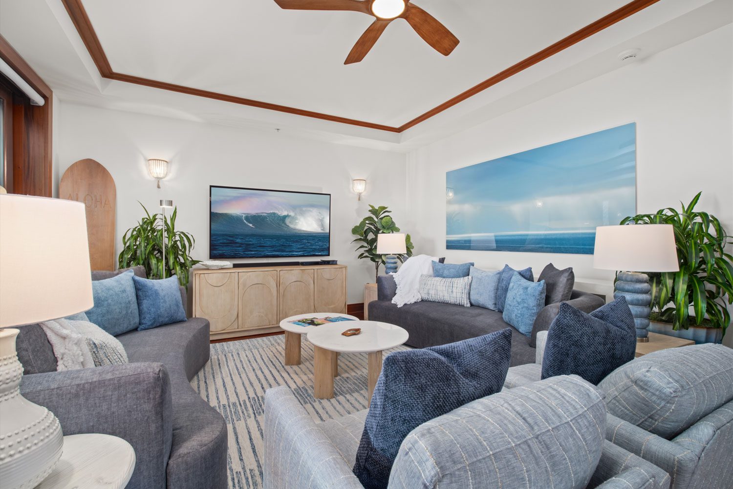 Maui Haven Premier Grand Residence 5201 at Montage Kapalua Beach is decorated in upscale coastal decor with quality furnishings and whimsical accent pieces that represent ocean and beach themes. The palette of pastel colors in blue and neutral tones create a casually elegant and welcoming backdrop for your home away from home.