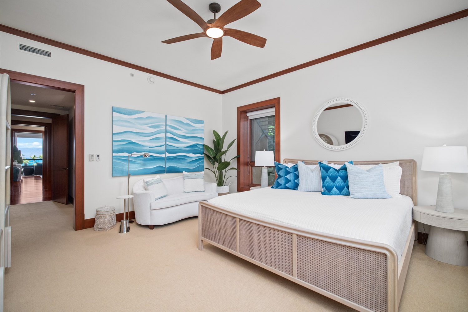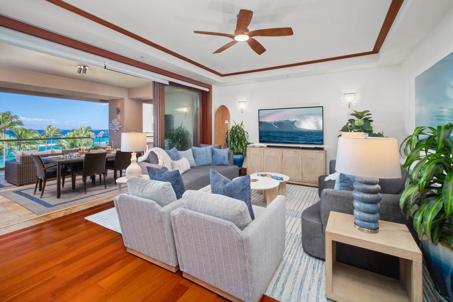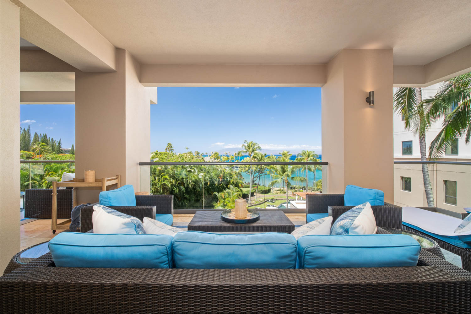 Maui Haven Premier Grand Residence 5201 at Montage Kapalua Beach is decorated in upscale coastal decor with quality furnishings and whimsical accent pieces that represent ocean and beach themes. The palette of pastel colors in blue and neutral tones create a casually elegant and welcoming backdrop for your home away from home.