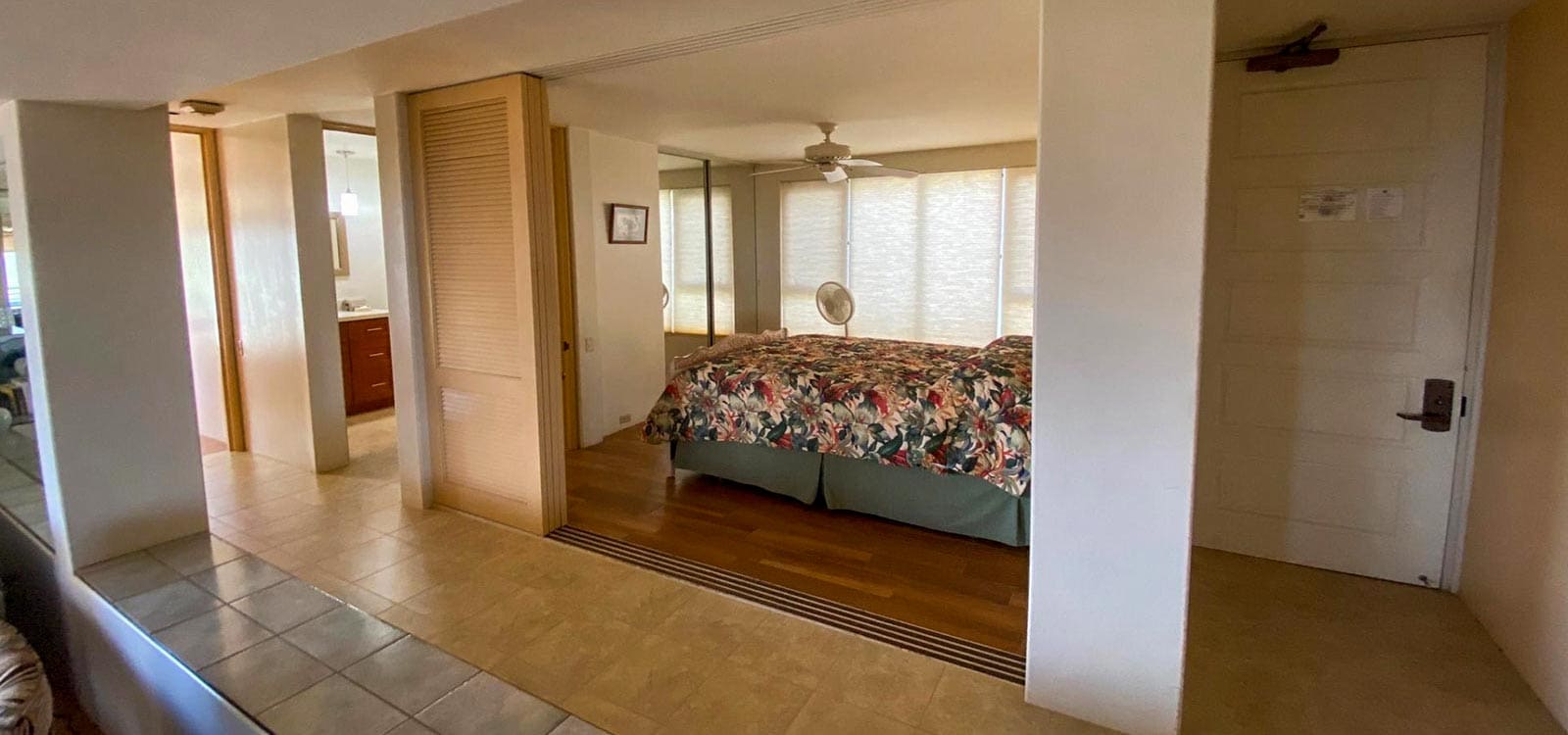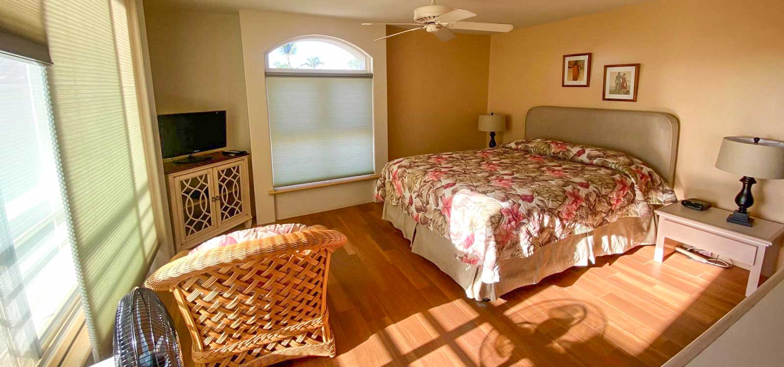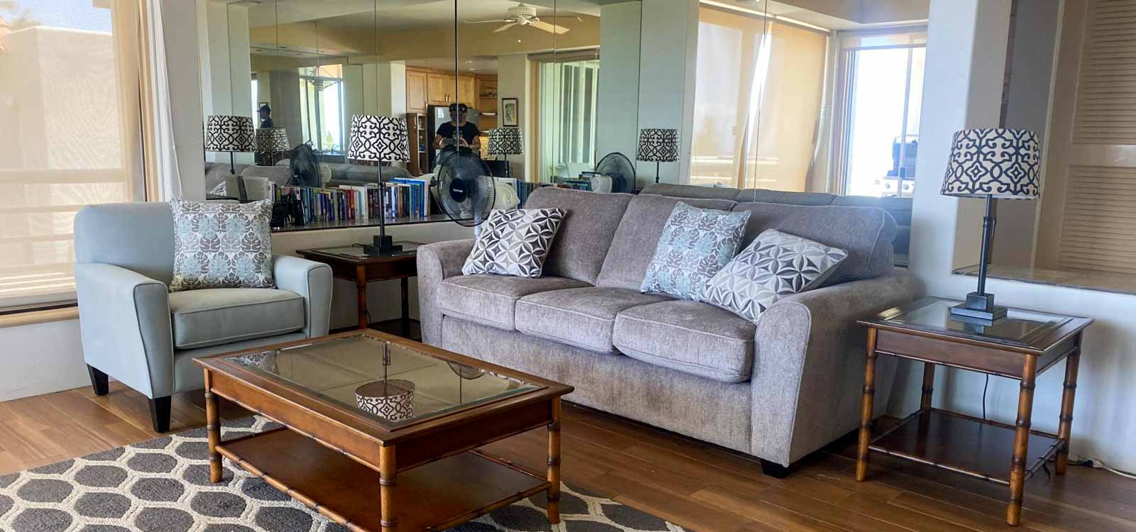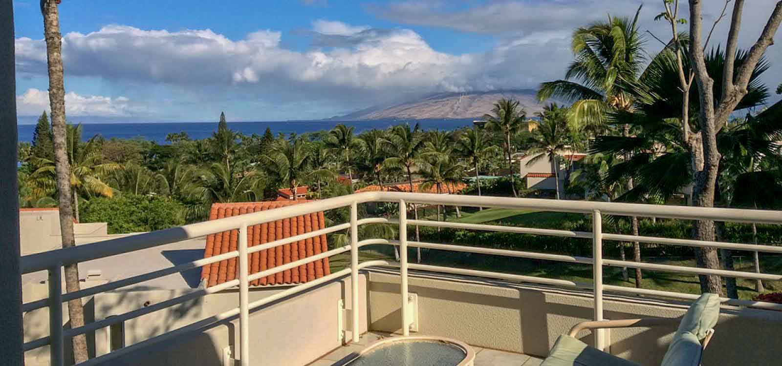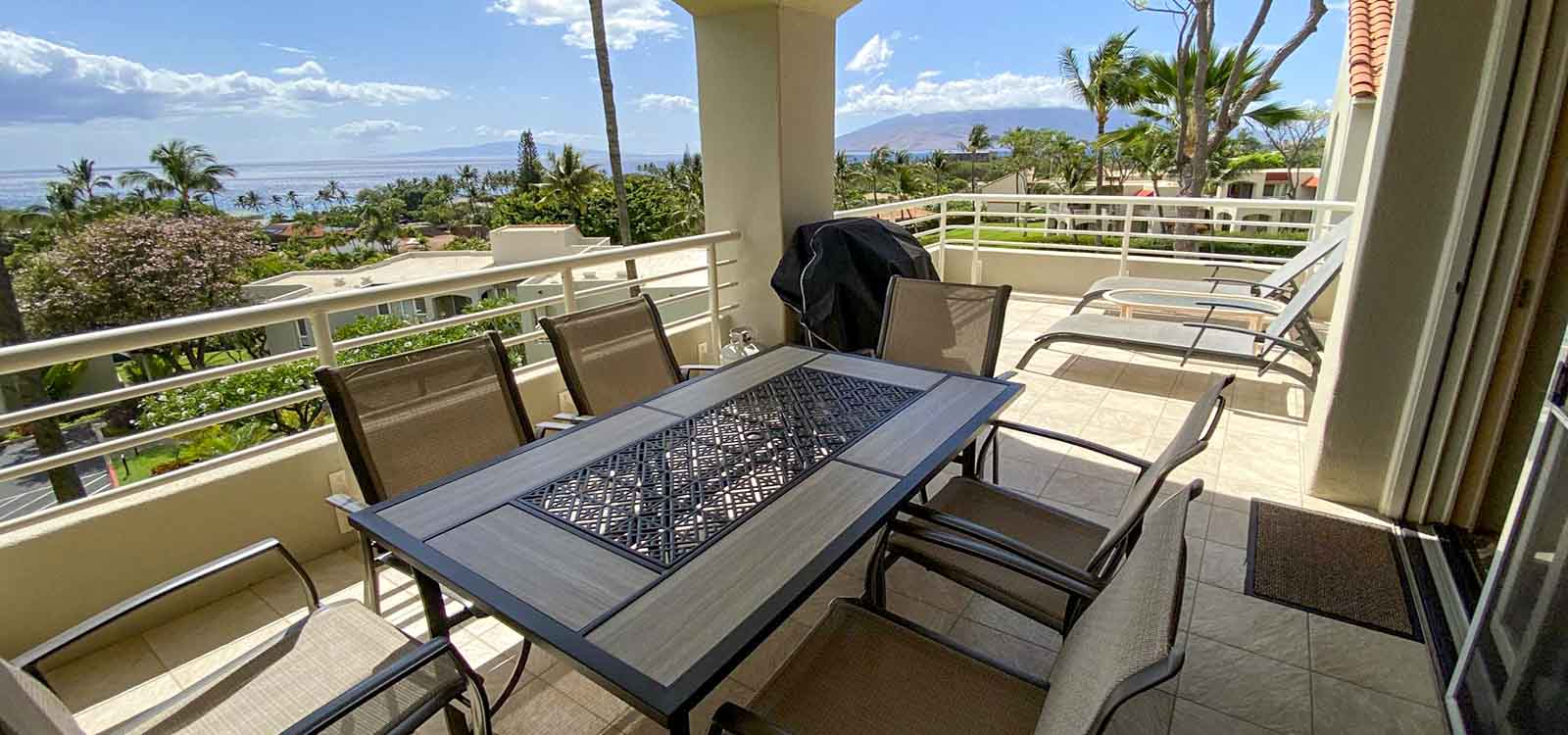 The Palms at Wailea 1102 is a private, 2 bedroom 2 bath condo with exceptional ocean views from Makena to Kaanapali. It features ocean views from all rooms, with a large private lanai for discrete sunning, dining and relaxing. There is a Weber gas grill on the lanai of The Palms at Wailea 1102. Note that air conditioning is partial, not full – there is an AC unit in the master bedroom suite only, but we have ceiling fans in all rooms and extra floor fans — and Maui’s cooling trade winds.