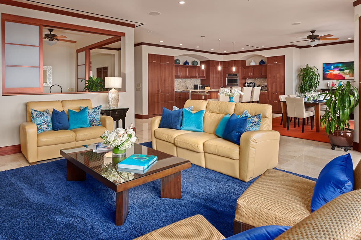 This villa is professionally appointed in a tasteful modern theme using leather furnishings, a blend of Asian inspired touches, and a cheerful color scheme that mixes celadon and jade greens, buttercream, turquoise, and sapphire blue. The walls, trim, and floors in Wailea Beach Villas Regal Mandalay were done in a custom color palette consisting of vanilla walls, rich butterscotch granite counters, and creme color travertine marble floors.