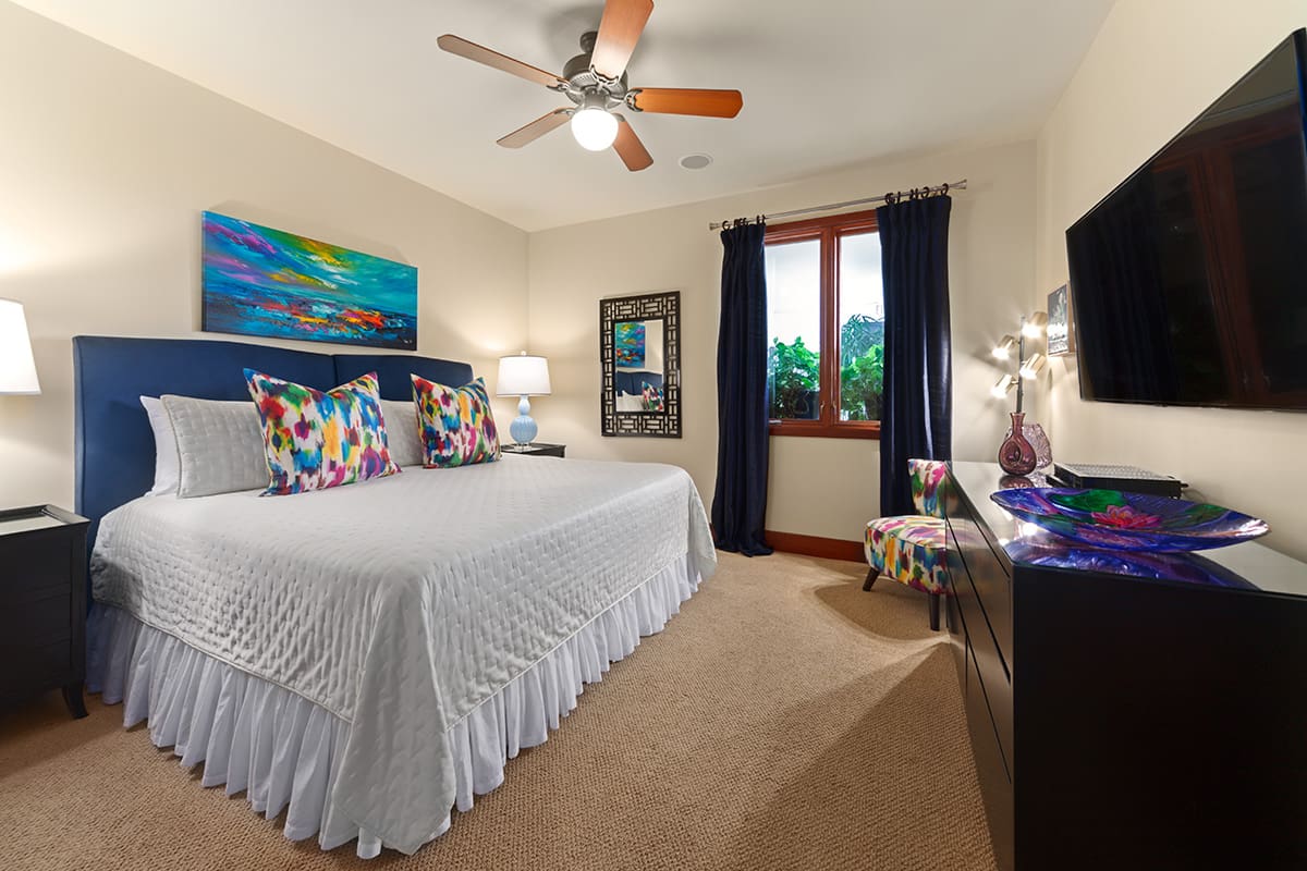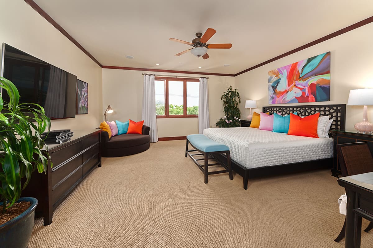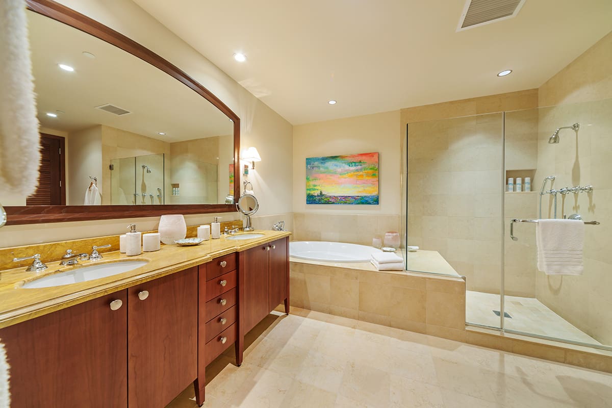 Wailea Beach Villas Regal Mandalay’s master bedroom has a king bed and the second bedroom provides a choice of two twin beds or a king bed. In the enclosed den room located off the great room is a third bed – a real queen bed, not a sleeper sofa! The den has shoji screens to provide excellent privacy.