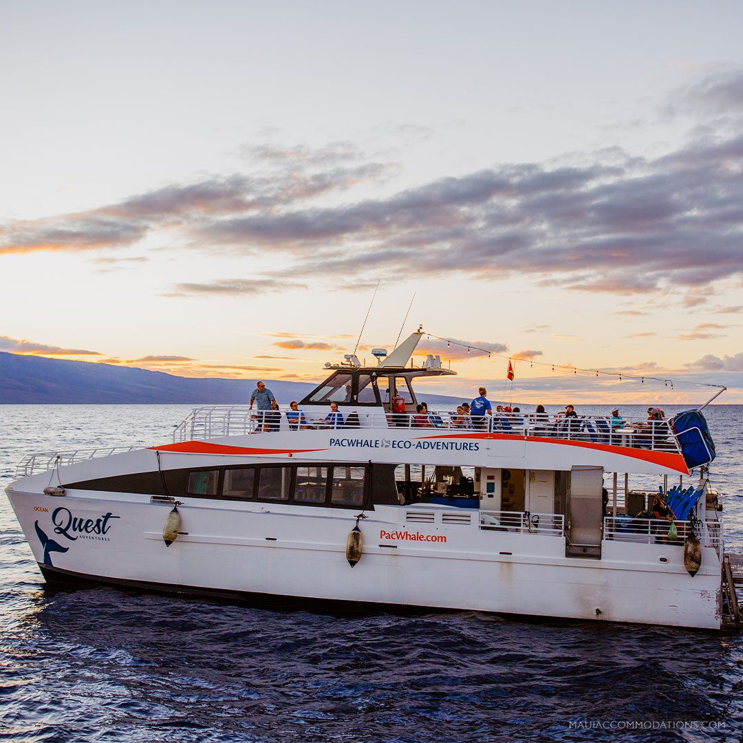 The Sunset Dinner Cruise promises a magical evening of gourmet dining and breathtaking views. Guests set sail aboard a spacious catamaran to enjoy a leisurely cruise along the stunning coastline of Maui. As the sun dips below the horizon, casting a golden glow over the ocean, passengers indulge in a delicious dinner featuring locally sourced ingredients and freshly prepared cuisine. With live music setting the mood, guests can relax on deck, sip cocktails from the open bar, and soak in the tranquil ambiance as the boat glides gracefully across the water. Whether celebrating a special occasion or simply enjoying a romantic evening with loved ones, the Sunset Dinner Cruise from Pacific Whale offers a memorable and enchanting experience against the backdrop of Maui’s scenic beauty.